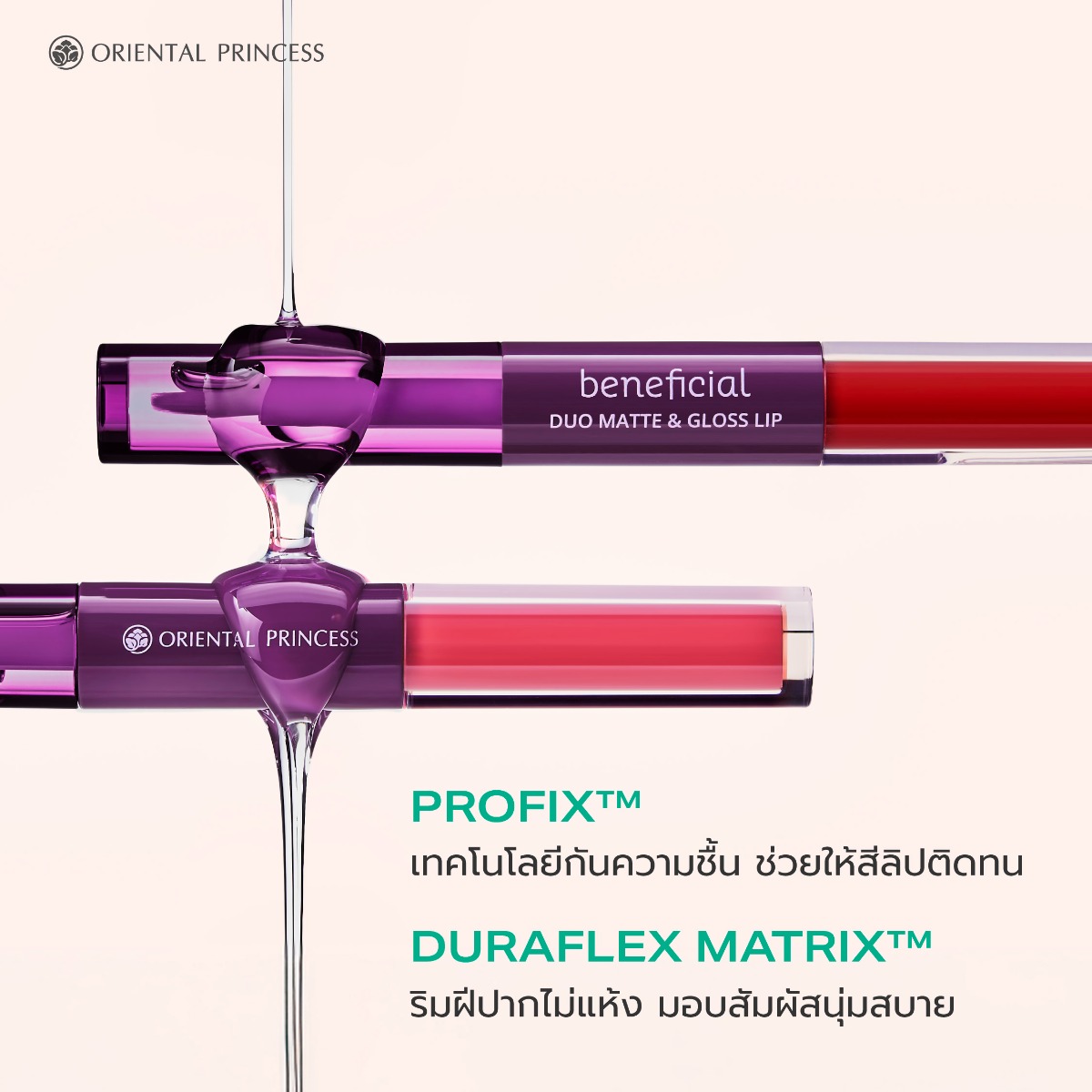 ลิปดูโอ 2 เนื้อ รวมลิปแมตต์กำมะหยี่และลิปกลอสฉ่ำวาวในแท่งเดียว สร้างเรียวปากสวยครบทุกมิติ ทั้งสีชัด ฟินิชเป๊ะ เบาสบายปาก ดีไซน์ให้เข้าได้กับทุกลุค ทุกโอกาส ไม่ต้องพกหลายแท่ง ไม่ต้องยุ่งยากหลายขั้นตอน มาทั้งหมด 5 สี 5 สไตล์ มอบฟินิชที่หลากหลาย ทั้งฟินิชแมตต์แต่ไม่หนักปาก หรือทาเนื้อกลอสทับเพื่อได้ฟินิชฉ่ำวาว ให้สีติดทนยาวนาน ไม่หลุด ไม่ลอก ปากสวยฉ่ำตลอดวัน ลืมลิปกลอสแบบเดิมๆ ได้เลย ติดทนขั้นสุดด้วยเทคโนโลยี Profix™ ฟิล์มซิลิโคนกันความชื้น ช่วยให้สีลิปติดทน สวยชัด ลดการเลอะระหว่างวัน และเทคโนโลยี DuraFlex Matrix™ ช่วยให้ริมฝีปากไม่แห้งแตก มอบสัมผัสนุ่มสบาย โดยไม่ทำให้รู้สึกหนักหรือตึงให้สีสวยชัด พร้อมบำรุงและปกป้องริมฝีปาก
