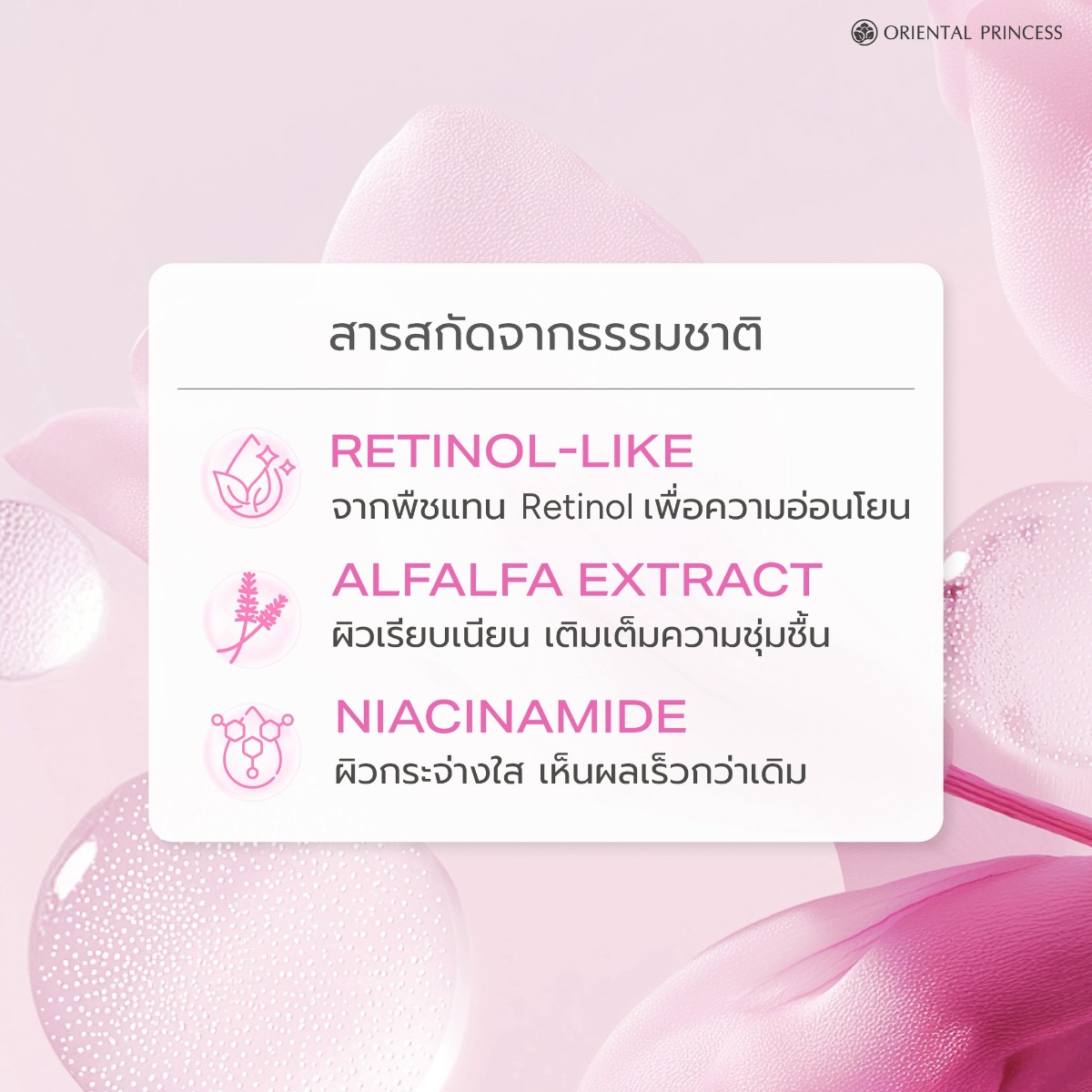 - Alfalfa Extract : อุดมไปด้วยสารต่อต้านอนุมูลอิสระ ซึ่งเป็นสารที่ช่วยเสริมสร้าง และซ่อมแซมเซลล์ต่างๆ ภายในร่างกาย กระตุ้นการสร้างคอลลาเจน และเสริมสร้างเซลล์ผิวใหม่ ให้ผิวดูเรียบเนียน