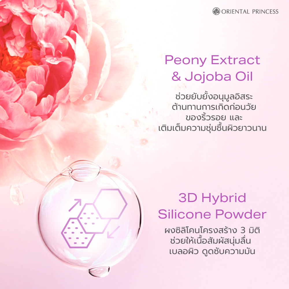 เสริมความชุ่มชื้น พร้อมยับยั้งอนุมูลอิสระ ต้านทานการเกิดริ้วรอยก่อนวัย เทคโนโลยีลิขสิทธิ์ 3D Hybrid Silicone Powder ผงซิลิโคนโครงสร้าง 3 มิติ ช่วยให้เนื้อสัมผัสนุ่มลื่น เบลอผิว ดูดซับความมัน ริมฝีปากเนียนเรียบไร้ที่ติ