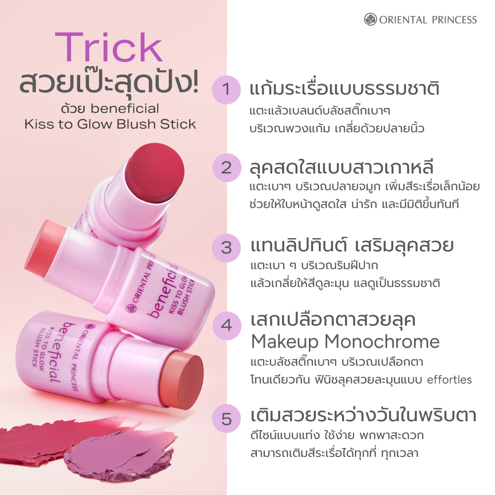 แม้จะอยู่ในช่วงเวลาที่แสนจะเร่งรีบแค่ไหน แต่เรื่องของความสวยก็ไม่ควรถูกละเลยแค่คุณมี Beneficial Kiss to Glow Blush Stick เพียงแค่แท่งเดียว คุณก็สามารถเสกสีสันสดใสให้กับพวงแก้ม ปาก และตาได้ทุกที่ ทุกเวลาที่ต้องการเพียงชั่วพริบตา แวะมาสัมผัสสีสันแสนสวยของ Blush Stick ได้แล้ววันนี้ที่ร้าน Oriental Princess ทุกสาขาหรือ OP Shop Online 24 ชม.