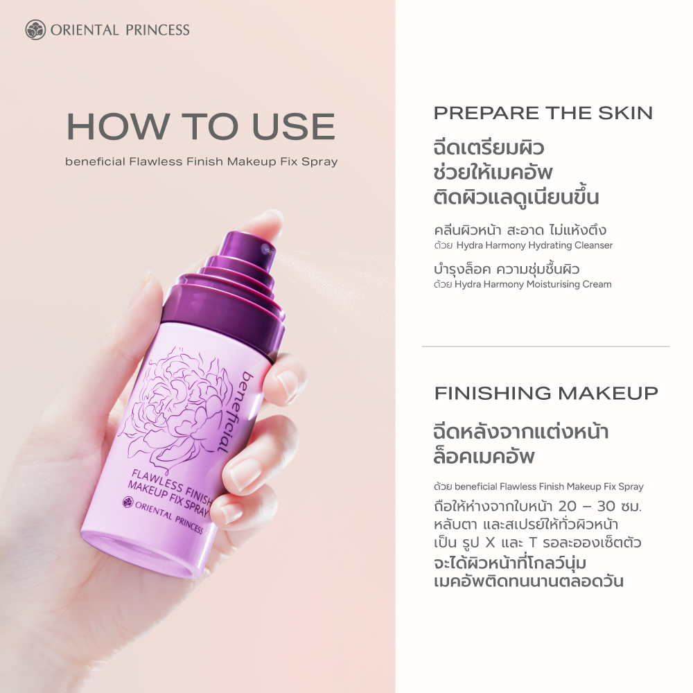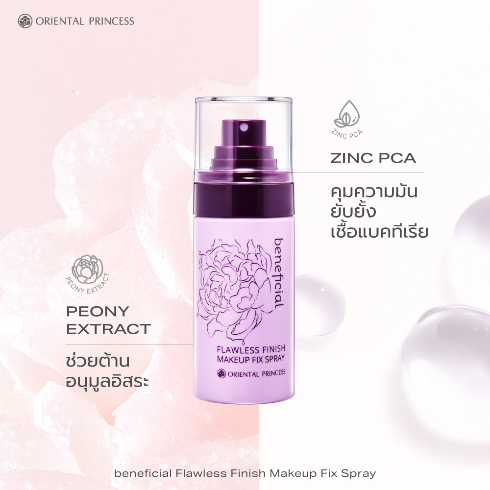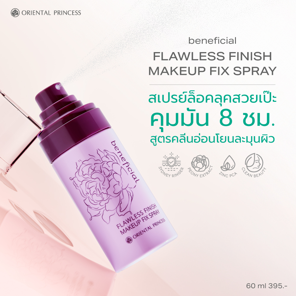 ล็อกเมคอัพให้สวยเป๊ะตลอดวัน ติดทนนานแม้อากาศร้อน ด้วย beneficial Flawless Finish Makeup Fix Spray สเปรย์ล็อคเมคอัพสูตรคลีนจาก Oriental Princess ตัวช่วยให้ผิวและเมคอัพติดทนนานเหนือระดับ ควบคุมความมันนานถึง 8 ชั่วโมง โดยไม่ทำให้ผิวแห้งตึง พร้อมบำรุงผิวสวยเปล่งประกายอย่างอ่อนโยนในขั้นตอนเดียว เมคอัพไม่ไหล หน้าไม่หยา ด้วยเทคโนโลยี Elastic Fix Veil Film Former สร้างฟิล์มโปร่งสบาย ยืดหยุ่นไปกับผิวได้ทุกการขยับ ช่วยให้เมคอัพเซ็ตตัวเรียบเนียน ไม่แตก ไม่ตกร่อง และ Sydney Ringer เสริมสร้างเกราะป้องกันผิว พร้อมมอบความชุ่มชื้นได้ทันที เมคอัพสวยติดทน พร้อมบำรุงและปกป้องผิว