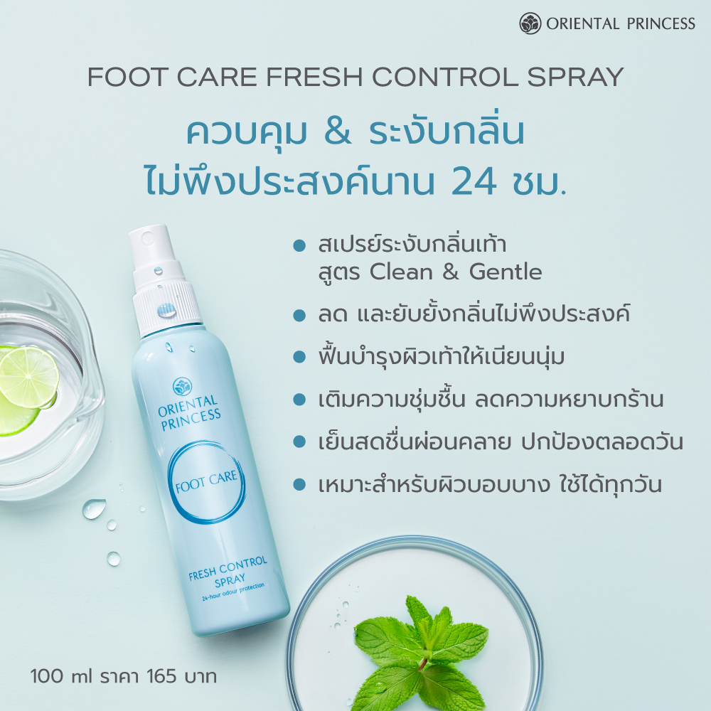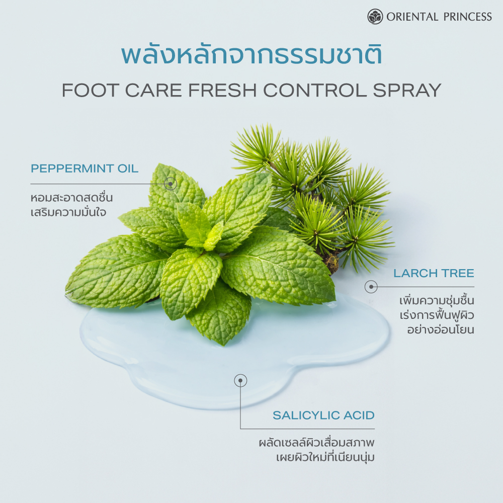 สเปรย์ดูแลผิวเท้า สูตร Clean Formula ช่วยลดและยับยั้งสาเหตุของกลิ่นไม่พึงประสงค์ยาวนาน 24 ชั่วโมง พร้อมมอบความเย็นสดชื่นทันทีที่ใช้ อุดมด้วยสารสกัดธรรมชาติจาก Larch Tree, Peppermint Oil และ Menthol ที่ช่วยปลอบประโลมและเติมความชุ่มชื้น เนื้อสัมผัสบางเบา ไม่เหนียวเหนอะหนะ มอบความรู้สึกแห้งสบาย พร้อมฟื้นบำรุงให้ผิวเท้านุ่ม ลดความหยาบกร้าน สุขภาพดี และมั่นใจในทุกก้าวเดิน เหมาะสำหรับผิวบอบบาง ใช้ได้ทุกวัน