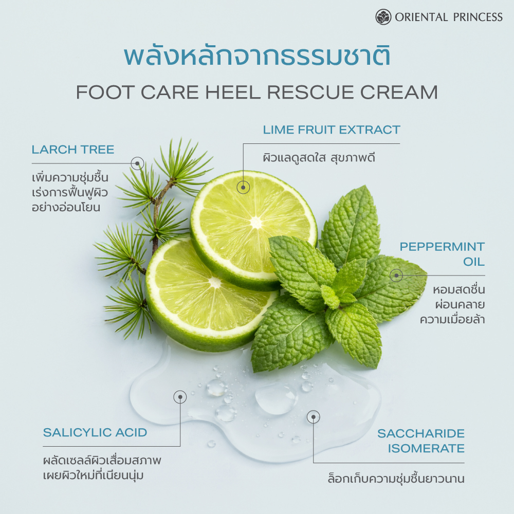 ครีมบำรุงเท้า สูตร Clean อุดมด้วย Salicylic Acid และสารสกัดธรรมชาติจาก Larch Tree, Lime และ Peppermint ช่วยผลัดเซลล์ผิวอย่างอ่อนโยน ลดความหยาบกร้าน ฟื้นบำรุงส้นเท้าแตกให้เนียนนุ่มชุ่มชื้นยาวนาน เติมและกักเก็บความชุ่มชื้นยาวนาน 12 ชั่วโมง ลดการกลับมาแห้งแตกซ้ำ พร้อมกลิ่นหอมสดชื่น ให้ความรู้สึกผ่อนคลายทุกครั้งที่ใช้