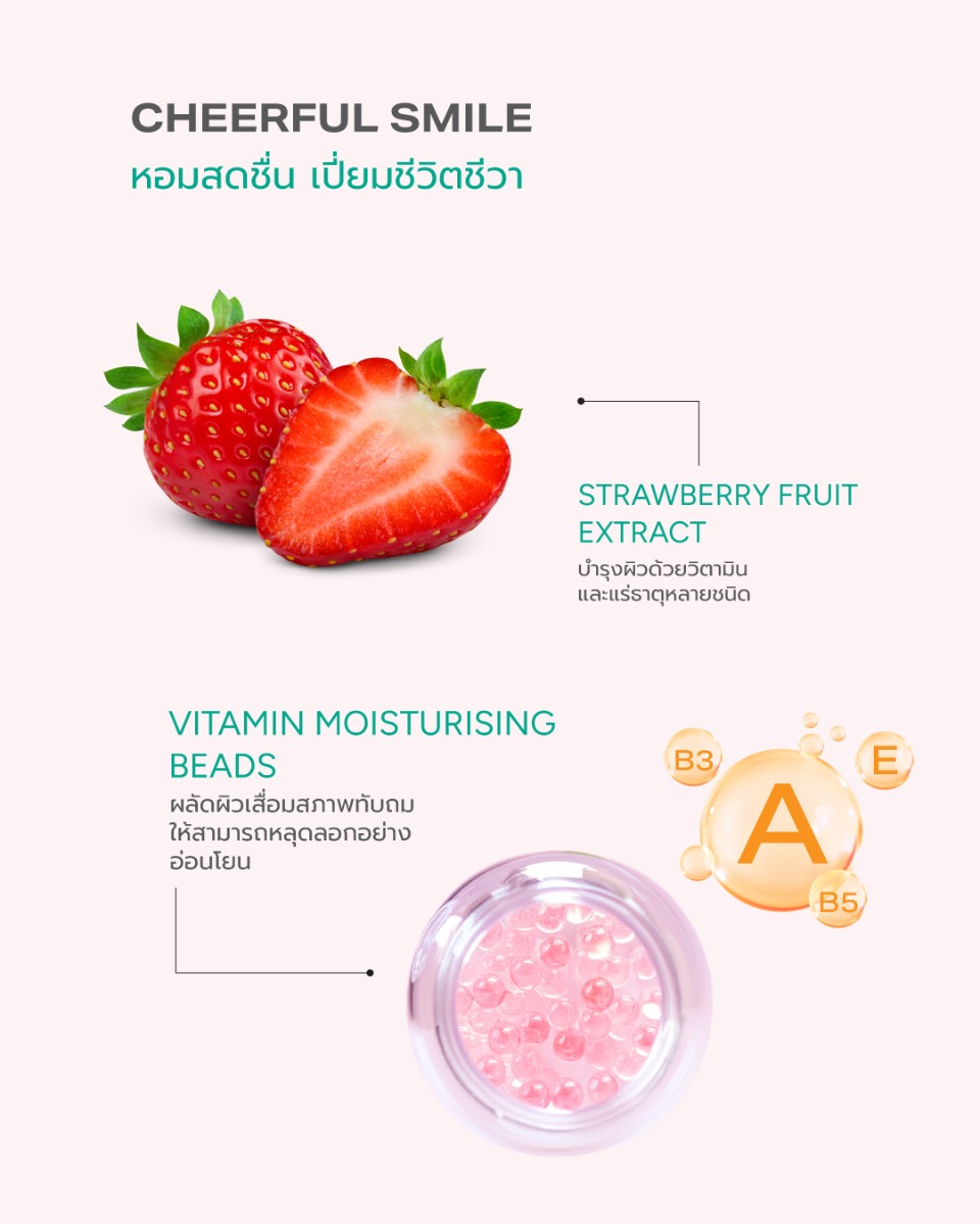 มอยเจอร์ไรเซอร์บำรุงผิว ที่มีกลิ่นหอมผลไม้เปรี้ยวอมหวาน พร้อม Vitamin Moisturising Beads ที่อุดมไปด้วยวิตามิน A,B3,E และ B5 บำรุงผิวให้นุ่มชุ่มชื่น ช่วยผลัดผิวเสื่อมสภาพ เพื่อเผยผิวใหม่ที่แลดูกระจ่างใส และสารสกัดจากข้าวโพดบริสุทธิ์ 100% ช่วยให้ผิวชุ่มชื่นยาวนาน